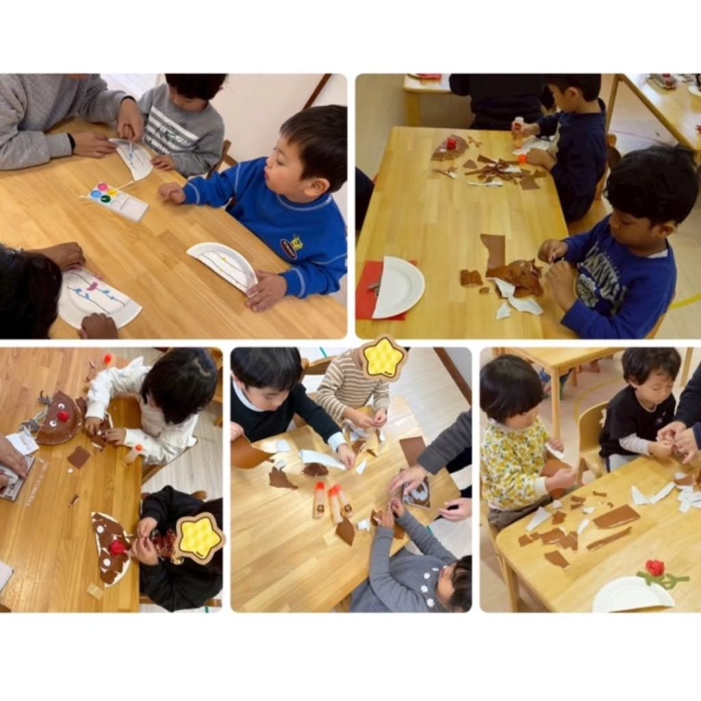 茶色の折り紙をちぎって紙皿に貼り付け、シールで目を貼ったり、お花紙で鼻を付けたりして、トナカイの顔を作りました🎅